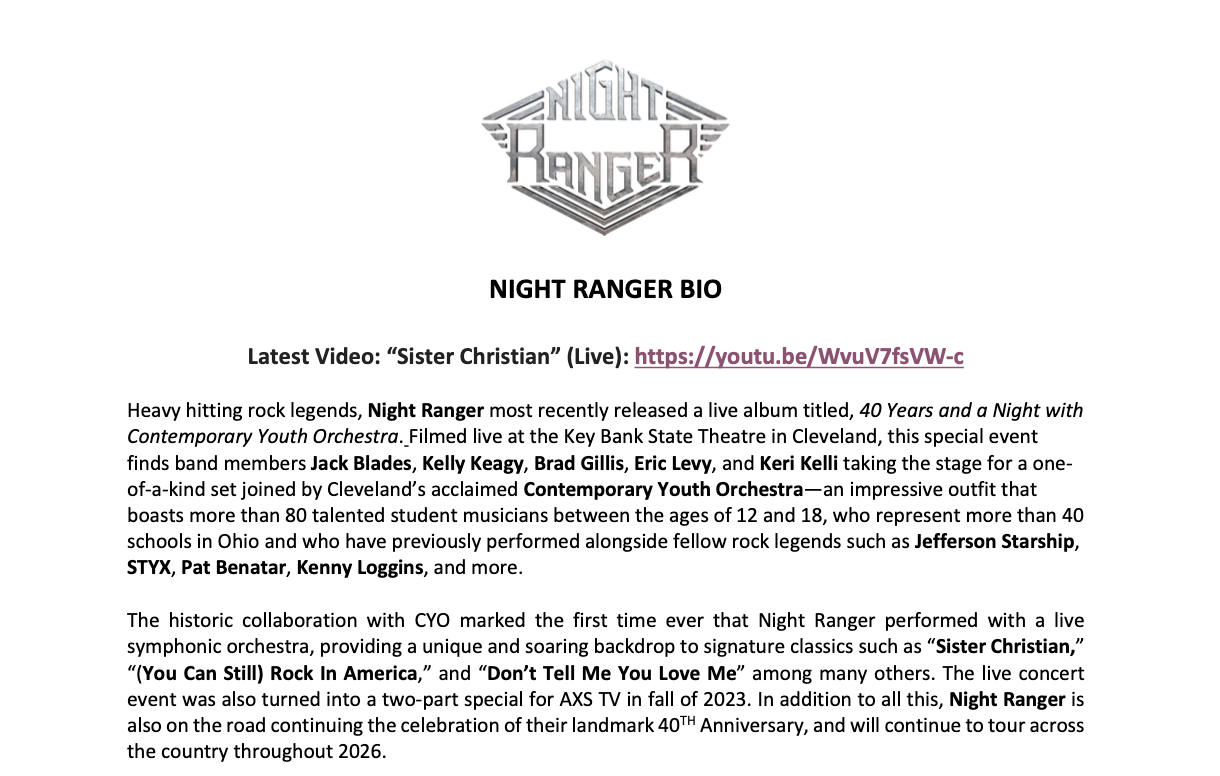 The historic collaboration with CYO marks the first time ever that Night Ranger has performed with a live symphonic orchestra, providing a unique and soaring backdrop to signature classics such as “Sister Christian,” “(You Can Still) Rock In America,” and “Don’t Tell Me You Love Me” among many others. The live concert event was also turned into a two-part special for AXS TV in fall of 2023. In addition to all this, Night Ranger is also on the road continuing the celebration of their landmark 40TH Anniversary, and will continue to tour across the country throughout 2024.